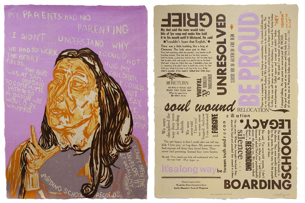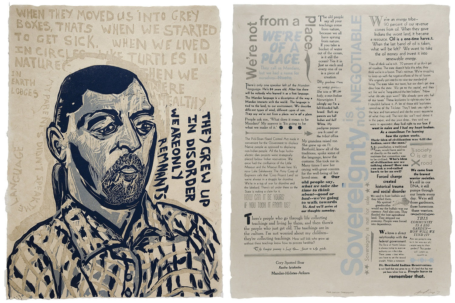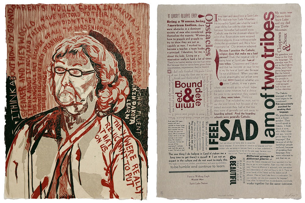 In Our Own Words: Native Impressions, a companion exhibition to Hear My Voice: Native American Art of the Past and Present, features a series of prints intended to highlight the life experiences of Native Americans living in North Dakota today. Daniel Heyman, whose previous work dealt with provocative social and political issues, collaborated with Lucy Ganje, who has family ties to tribal nations in North Dakota, to produce the portfolio under the guidance of master printer Kim Fink. The two artists listened to members of North Dakota's four remaining tribal nations talk about their personal and family histories. The series of 26 prints on handmade paper is made up of twelve pairs of portraits and broadsides that include excerpts from these interviews, plus a title page and colophon.