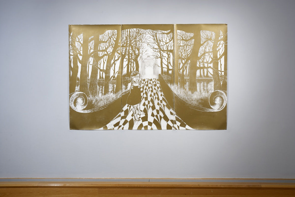 "Featured works include six prints from Perrone's ambitious series In The Realm of Reverie (2006-2008), which are four-foot-high by six-foot-wide woodcut prints with goldpoint and silverpoint drawing on Mylar.  The works blend autobiography, mythmaking, and a yearning for both the familiar and the exotic.  In each print, Perrone uses the expressive language of woodcut printing to dramatize figures, architectural features, and foliage in the foreground and middle ground.  In contrast to the gold and umber tones of the printing ink, Perrone portrays distant vistas in the soft, luminous, and ethereal tones of silverpoint and goldpoint drawing.  The two mediums comment on each other, imply contrasting states of awareness, and question the other's primacy, reality, and completeness.