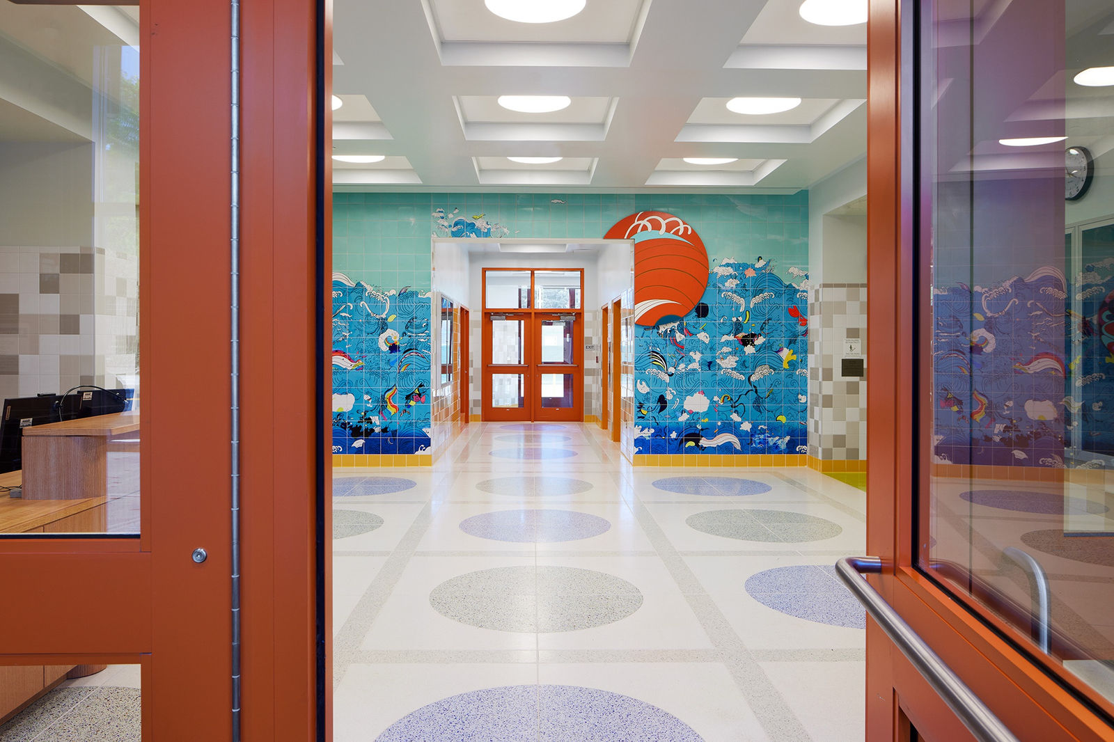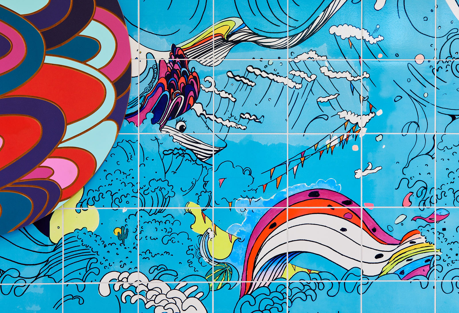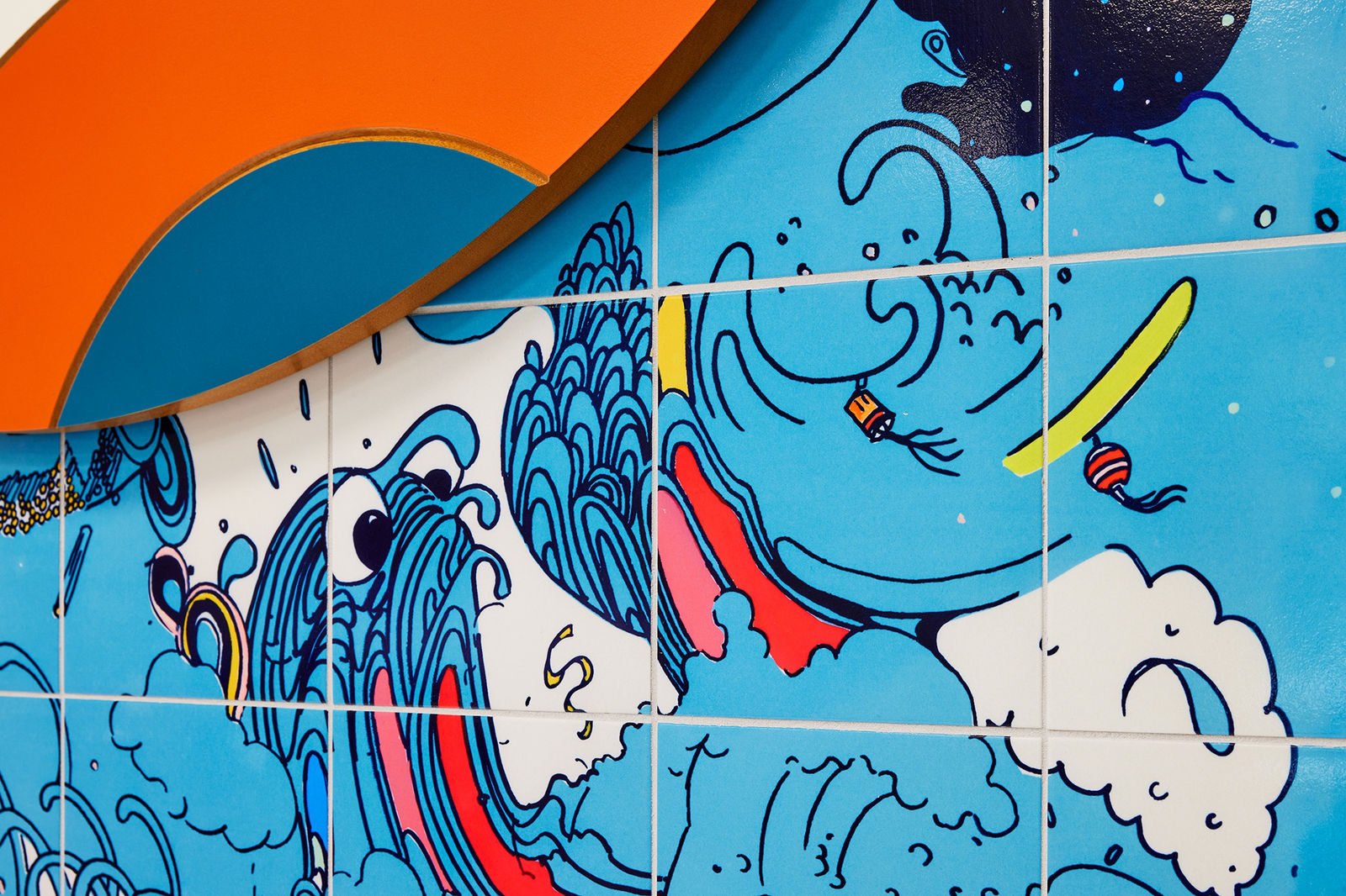 Curious Tide is an artwork by Allison Bianco at PS 958 Brooklyn. Inspired by the ocean and beaches on New York City’s coastlines, the work features a tile mural of waves, creatures, plants, animals, food, and objects influenced by local iconography. A dramatic interaction between water and sky foreshadows a physical shift of the oceanscape beneath, with unexpected objects and color designed to provide moments of humor and wonder. The weathering and entanglement expressed in the mural are linked to remembrances of shared and changing places.